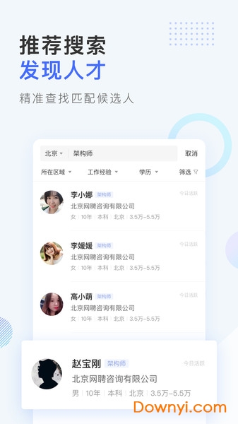 搜索人才:提供高级搜索功能,支持按行业、职位、薪资等20余个维度组合查询,搜索结果可一键收藏或批量导出,满足企业个性化人才猎取需求;
