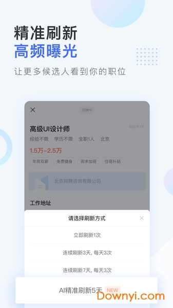 【智能刷新】动态调整职位曝光策略,在求职者活跃时段自动提升展示频次。实测显示可使职位浏览量增加2-3倍;