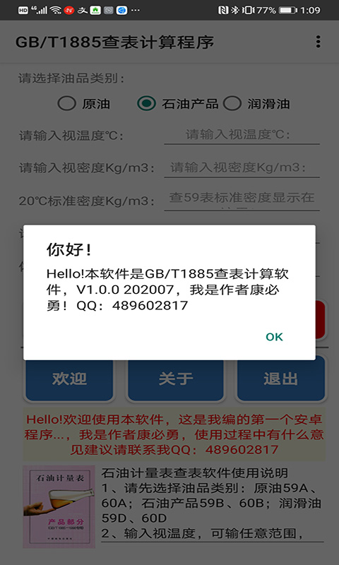 在使用本软件进行石油计量计算时,请按照以下步骤操作:首先需要选择油品类别,包括原油59A、60A;石油产品59B、60B;润滑油59D、60D等选项。接着输入视温度参数,该参数可以输入任意范围数值,但通常使用范围为-40℃至100℃。然后输入视密度值,对于原油和石油产品,输入范围一般为610→1164Kg/m3;润滑油则为801→1164Kg/m3。