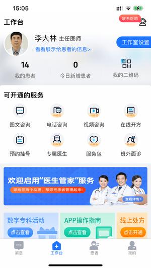 对首页展示进行了全面优化,使医生服务管理更加便捷高效。新增了一键定时关闭线上服务的功能,帮助医生更好地管理工作时间。在我的患者模块中,新增了按疾病标签统计患者人数的功能,方便医生进行数据分析。同时优化了个人中心的界面展示,使各项操作更加直观方便。