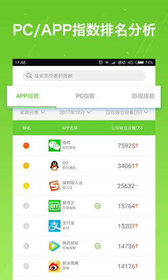 艾瑞指数优化了PC指数筛选功能,新增了多维度筛选条件,用户可以更精准地获取所需数据。同时改进了数据可视化效果,支持自定义图表导出功能。艾瑞指数新增2个指数榜单:指数和移动设备指数,这两个榜单基于海量用户行为数据构建,能够真实反映各行业在移动互联网时代的发展状况。新增的指数榜单还支持历史数据对比分析,帮助用户发现行业发展趋势。
