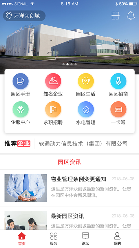首页主要的功能模块有园区切换,以及八个快捷菜单园区手册、园区企业、园区生活、园区招商、企服中心、、政策法规、金融/制造方便用户快速了解万洋众创城,还有推荐企业、园区咨询、扫码、系统消息等功能。界面设计简洁直观,操作流程优化,即使是首次使用的用户也能快速找到所需功能。系统还支持个性化定制,用户可以根据自己的使用习惯调整首页布局。