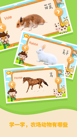 游戏采用国际顶级插画师绘制的精美画面,每个场景都充满童趣和细节。专业播音员录制的中英文双语发音,确保语言学习的准确性。根据蒙特梭利教育理念设计的认知系统,从基础辨认到进阶选择,科学引导孩子学习。将传统科普知识转化为互动游戏,比如通过"给小羊喂食"来了解绵羊的生活习性。收录了数十种农场动物的真实叫声,配合生动动画,打造沉浸式学习体验。定期更新的主题动画片,持续激发孩子的探索兴趣。