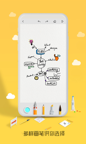 【笔触和色彩选择】提供钢笔、铅笔、马克笔、毛笔四种笔触,搭配丰富的调色盘,让你的书写不再单调。无论是严肃的笔记还是随性的涂鸦,都能找到最适合的表达方式。