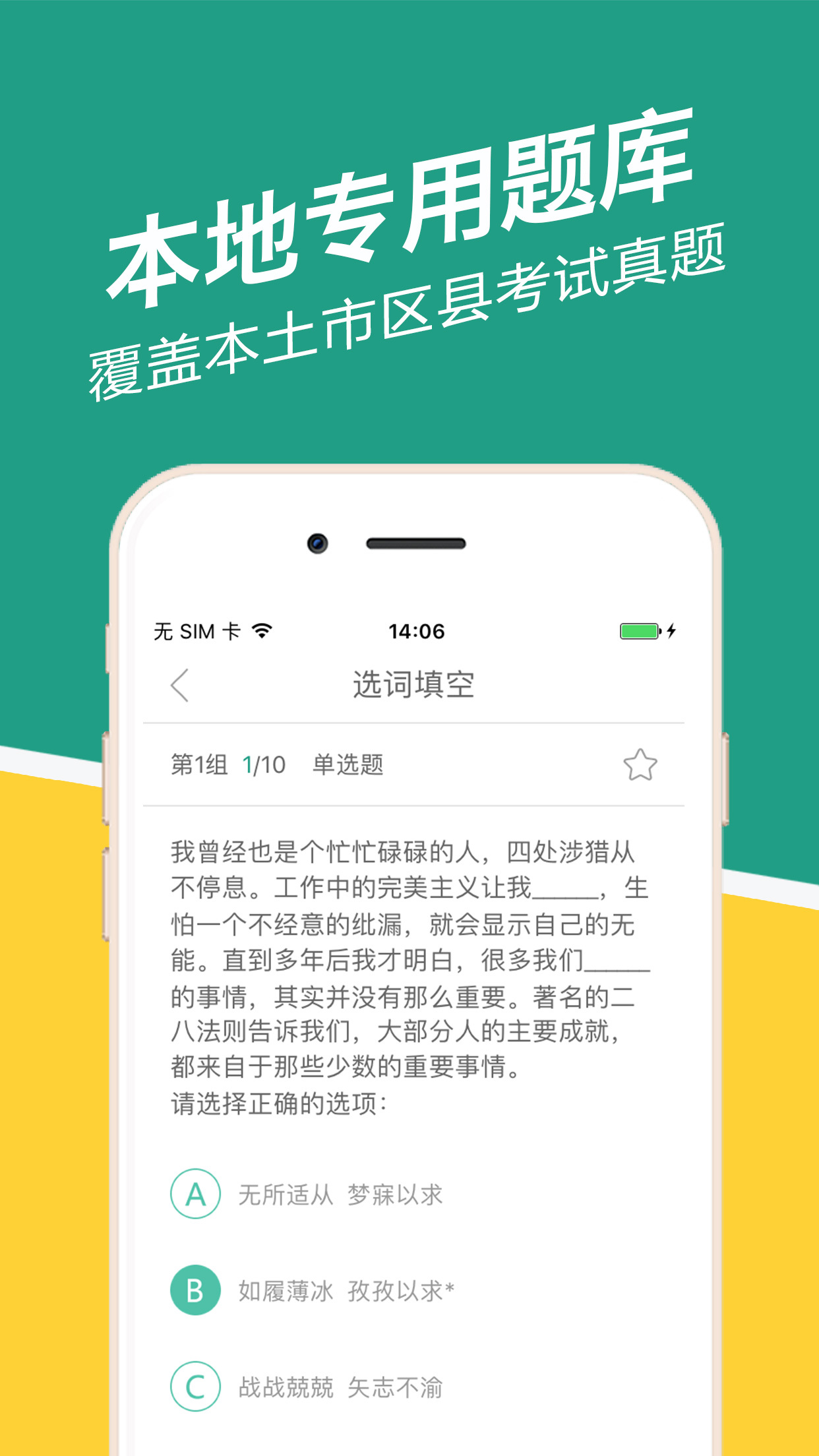 模拟测试:模拟真实考试场景,检验你的事业单位考试备考成果,完全还原考试流程和时间限制。每次模拟考后生成详细分析报告,帮助考生了解自身水平,调整备考策略。