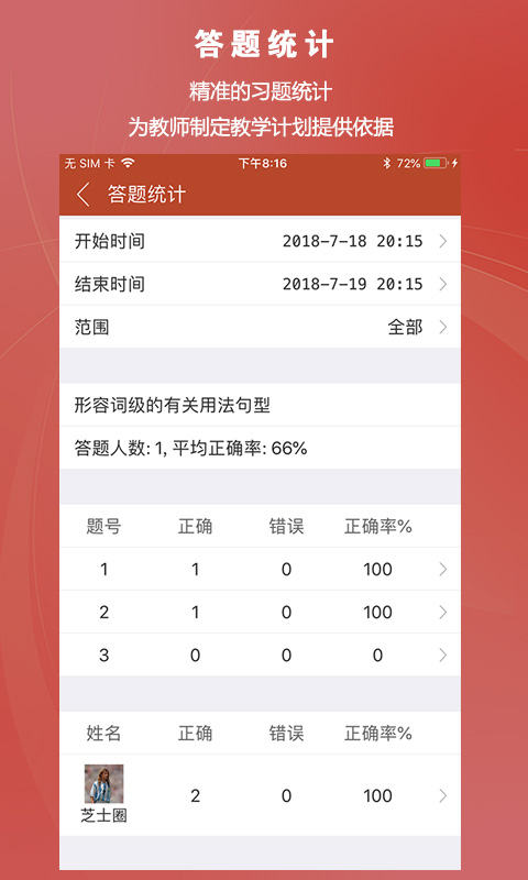 提供包括答题人数、正确率、常见错误等在内的多维数据分析,助力教师精准掌握教学效果。