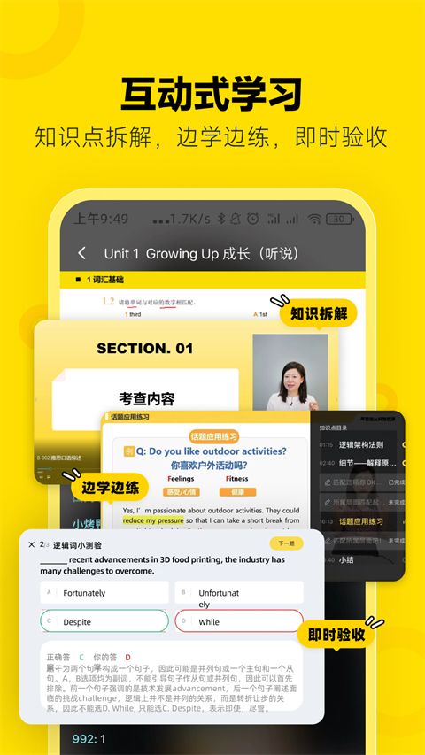 完整收录剑桥雅思系列真题,包含听力音频和阅读原文。每道题目都配有资深讲师的视频解析,详细讲解解题思路和应试技巧。支持错题重做和笔记功能,方便考生反复练习,深入理解考试要点,全面提升应试能力。