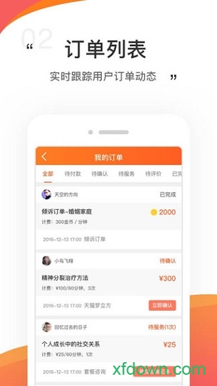 订单列表功能让您随时掌握咨询预约情况,系统会智能提醒即将开始的咨询。您可以查看历史订单记录,了解服务评价,持续优化服务质量。订单状态实时更新,支持多种筛选条件,让咨询管理更加高效便捷。我们相信,每一个订单背后都是一份信任,值得我们用心对待。
