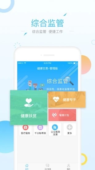 健康甘肃管理版目前规划研发的功能主要包含健康扶贫、医疗服务、公共服务、药品采购、卫生资源、分级诊疗、千分制考核、公立医院改革、卫计信息等功能,未来还将接入AI辅助诊断等创新技术。