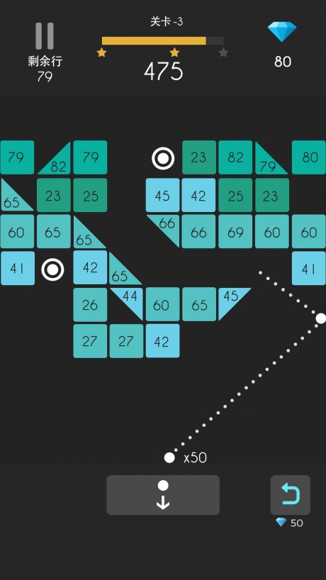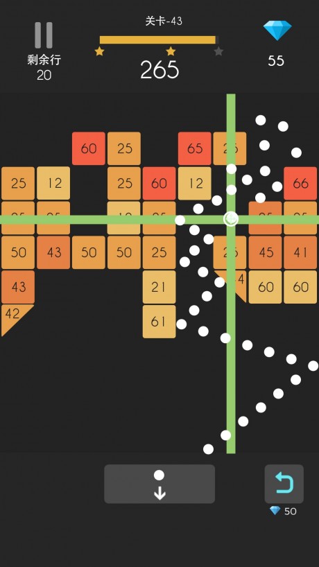 游戏采用创新的动态方块系统,当玩家发射球后,方块会根据球的弹跳轨迹产生连锁反应。部分球会先落地,待所有球落地后,剩余方块会自动下移,增加了游戏的策略性。玩家在发射前需要仔细规划路线,让球能在方块间进行多次弹跳,最大化消除效率。特别要注意的是,不能让方块落到屏幕底部,否则游戏就会结束,需要快速消除出现在底部的方块来维持游戏进程。