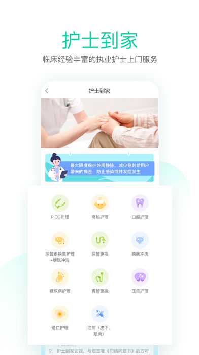 主要有护士到家和出院回家(专科延续护理)两大服务,包括C护理、清创换药、压疮护理、造口护理、注射、吸痰护理、口腔护理、放置胃管、神经内科、神经外科、心内科、消化科、肿瘤科、妇产科、儿科、骨科、肾内科、普外科、呼吸内科、内分泌科等;服务范围覆盖常见病、慢性病及术后康复需求,满足不同用户的个性化护理需求。