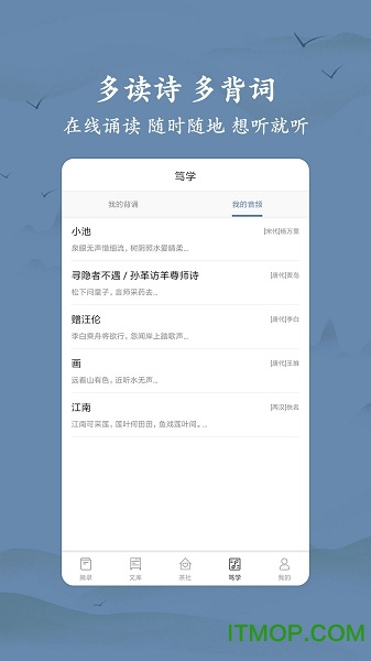 斟一壶丹泉,走进历史的文字和语言,与过往的文人墨客共饮,随意在唐诗宋词里,捡一个故事,与友人共享。软件每日推送经典名句,配以精美插图和背景故事解读。用户还可以收藏喜爱的诗句,建立个人诗词库,随时温习欣赏。