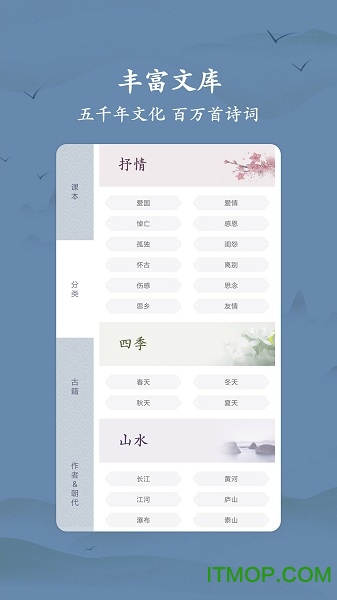 中华诗词辉煌千年,九州同济万古流传,流传下来的诗词岂止千万首,让中国古代诗词,深深印在国民大众的脑子里,成为"中华民族文化基因"。软件精选历代名家名作,按照朝代、作者、题材等分类整理,方便用户系统学习。透过诗词之美传承和弘扬社会主义核心价值观,从古人的智慧和情怀中汲取营养,涵养心灵。软件还定期更新内容,收录最新研究成果和名家解读,让用户随时掌握诗词研究动态。