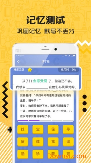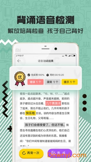专业主播领读功能由一级播音员录制,确保每个发音都标准清晰,帮助学生掌握最地道的语音语调。创新的图像记忆系统将抽象文字转化为生动画面,让背诵过程充满趣味性,孩子再也不会抗拒背诵任务。智能语音识别技术能实时检测背诵情况,精准指出错误发音和遗漏内容,让家长辅导更省心。惊人的记忆效果让5分钟背诵一首古诗、两遍掌握一篇课文成为可能,彻底告别耗时低效的死记硬背。互动PK模式支持同学间相互切磋,在趣味竞争中巩固记忆效果,形成长期记忆。持续使用还能显著提升右脑记忆能力,其效果是传统文字记忆的10倍以上,长期训练更能激活右脑思维,全面提升学习能力。