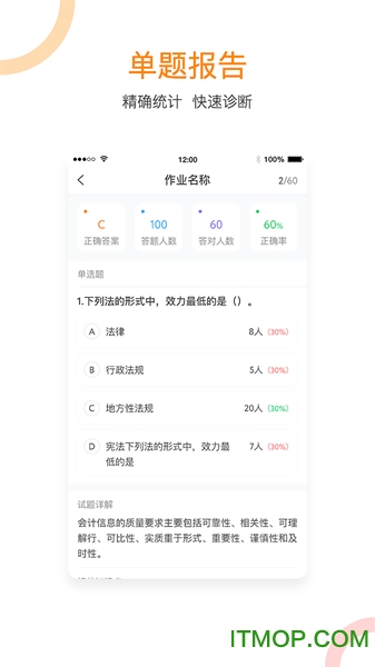 作业管理:教师可以随时发布作业和测试题,系统会自动生成详细的答题分析报告,包括班级整体表现和个别学生的答题情况。