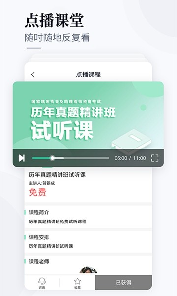 直播课堂功能让学员可以实时参与名师授课,与老师互动交流,解决学习中的疑难问题;在线咨询服务由专业导师团队提供,随时解答学员疑问;商城模块汇集各类医学图书和备考资料,一站式满足学习需求;每日任务系统帮助学员养成良好的学习习惯;收藏功能让学员可以随时回顾重点内容;扫码功能方便学员快速获取相关资料。