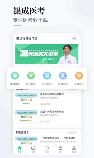 银成医考是一款专为医学考试备考者打造的全方位学习平台,致力于帮助用户高效备考、顺利通关。平台汇聚了海量优质课程资源、权威题库系统以及最新考试资讯,为医考学子提供一站式学习解决方案。无论您是准备执业医师、助理医师资格考试,还是备战考研西医综合,银成医考都能满足您的学习需求。