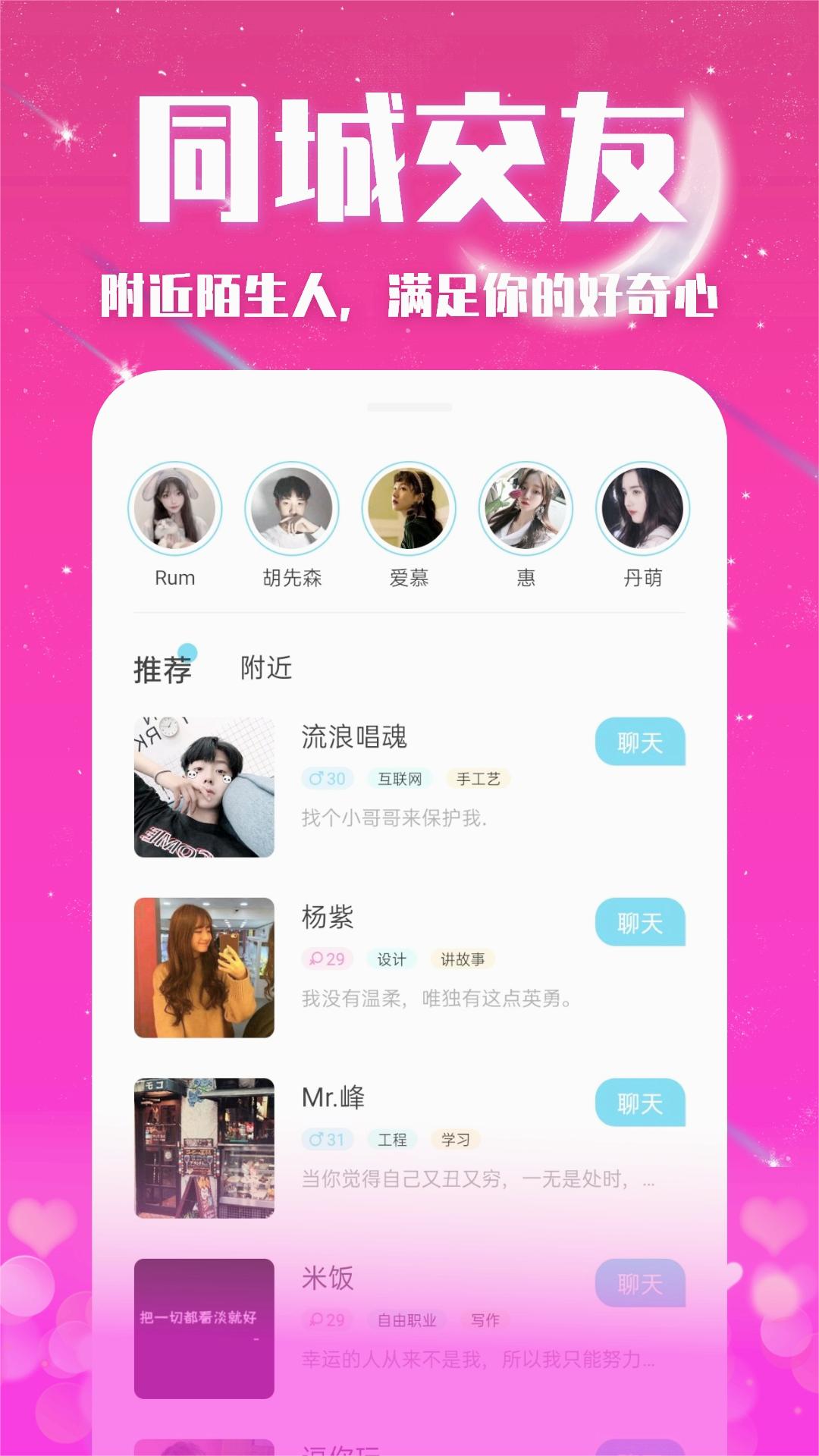 独特的匹配系统能快速为你推荐可能感兴趣的对象,遇到心仪的人可以直接发起聊天,打破传统交友的等待时间,大大提高脱单效率。