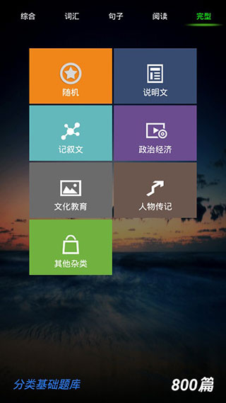 "综合训练":系统随机抽取各类题型组成综合练习,全面检测英语能力。训练内容覆盖各个知识点,帮助用户发现知识盲区,为系统复习提供参考。