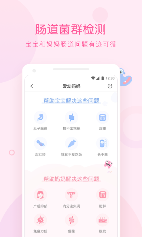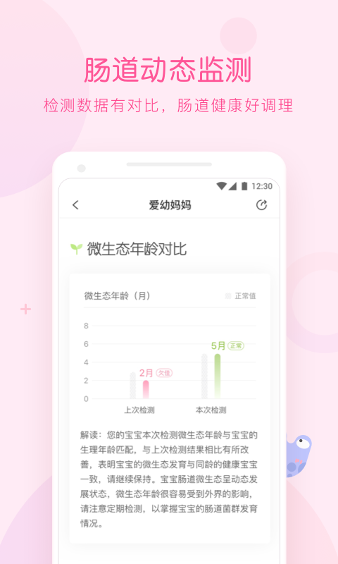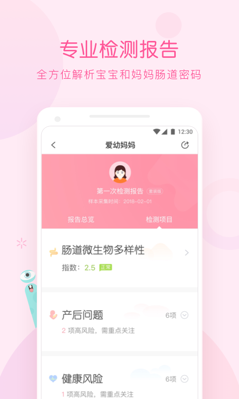 肠道微生物检测:爱幼妈妈提供便捷的母婴肠道微生物共同检测服务,只需在家取样即可完成检测。通过科学分析肠道菌群状况,帮助妈妈和宝宝预防潜在健康问题。检测报告涵盖产后恢复、营养吸收、健康状况、体重管理等46个项目,由专业团队提供详细解读和个性化建议,让健康管理更有针对性。