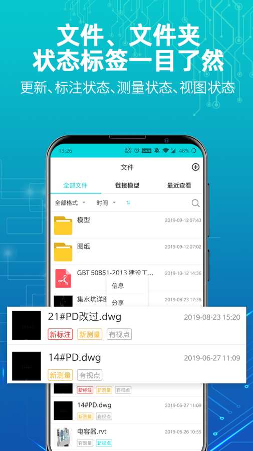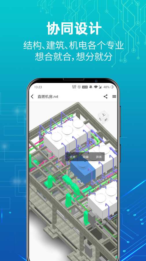 软件支持包括rvt、stl、obj、rfa等在内的40多种3D模型格式,全面兼容BIM模型体系。采用智能断点续传技术,大模型上传不再困扰,配合HASH校验机制避免重复上传。革命性的轻量化处理技术,让百兆级的Revit等BIM模型实现秒级加载,即便是复杂的大型模型也能在移动设备上流畅浏览。内置专业级BIM浏览器,提供动态旋转、自旋转、约束旋转等多种观察模式,支持平移、缩放、选框、剖切等高级操作,具备构件分类查看、漫游导航、属性查询等专业功能,所有视图设置均可保存。