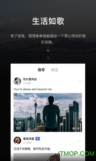 音兔(Intoo)是一款简单有趣的音乐短视频应用,致力于为用户提供最便捷的音乐视频创作体验。通过音兔,你可以方便地将视频与图片素材快速制作为高质量的音乐短视频,用最简单的方式,把生活拍成一部电影。无论是日常记录还是创意表达,音兔都能满足你的创作需求,让音乐与影像完美结合。