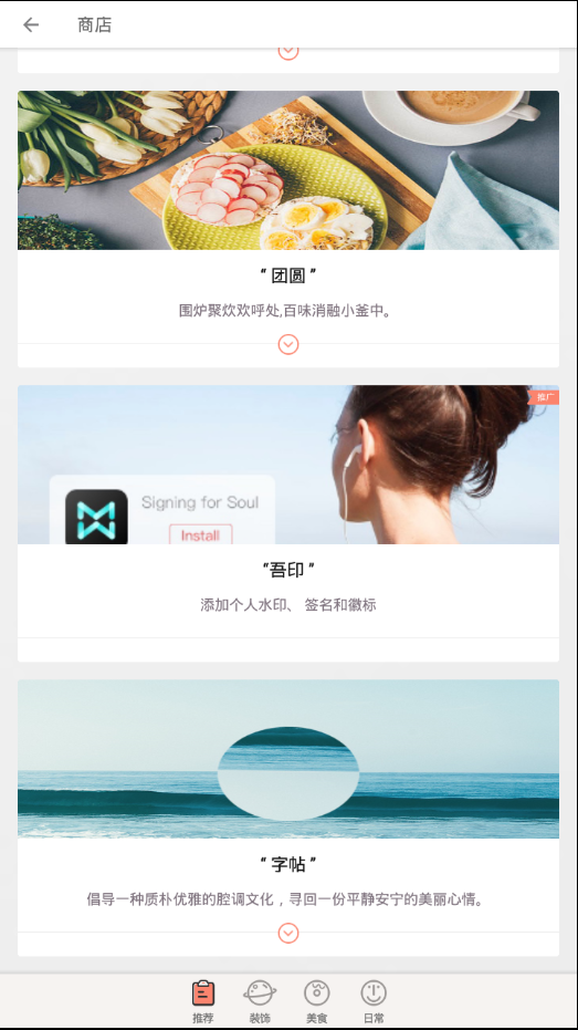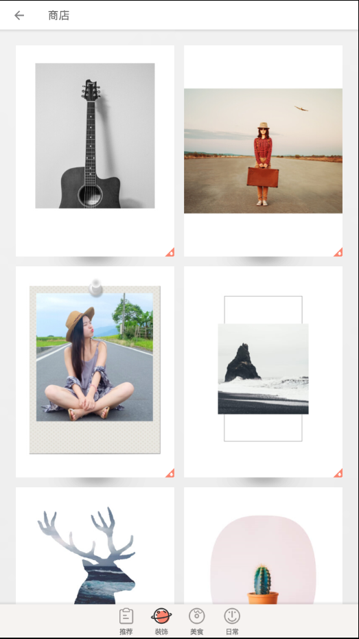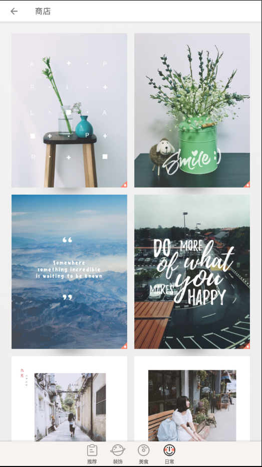 推荐给你不一样的内容:优雅、装饰、美食、日常等多种主题模板,让你的照片更具个性化。