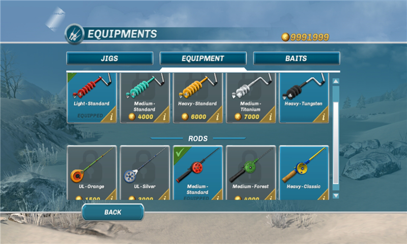 本版本已经过修改,玩家可以获得无限金币。进入游戏主菜单界面后,点击右侧的"EQUIPMENT"(房屋图标)即可立即获得大量金币,用于购买和升级各种高级渔具。