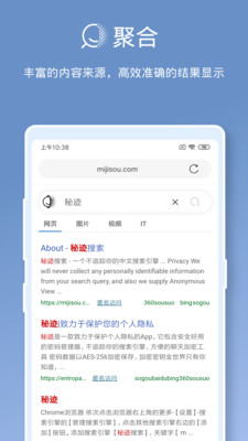 秘迹搜索是一款专注于保护用户隐私的聚合搜索引擎,致力于为用户提供安全、无痕的搜索体验。它不会追踪用户的关键词,也不会根据搜索内容进行个性化推荐,彻底杜绝隐私泄露的风险。通过整合百度、Bing、360、搜狗等主流搜索引擎的结果,秘迹搜索在保证搜索结果质量的同时,为用户打造了一个干净、纯粹的搜索环境。无论是日常信息查询还是专业资料检索,秘迹搜索都能满足您的需求,让您在享受便捷搜索服务的同时,不必担心个人隐私被窥探。