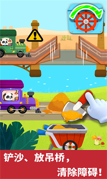 游戏包含四大特色场景,通过观察不同环境的细节特征,培养孩子的观察能力。驾驶神奇小火车加速前进,穿越田野、城市、隧道,最终抵达神秘的沙漠地区,探索沙漠中独特的动植物生态;学习实用的乘车知识,帮助乘客完成检票流程,识别行李箱中的危险物品,引导乘客有序排队,确保乘车安全;挑战七大趣味关卡,当小火车遇到困难时,需要孩子们开动脑筋解决问题,包括放下闸栏、清理铁路、修复铁轨等任务,确保火车顺利行驶。