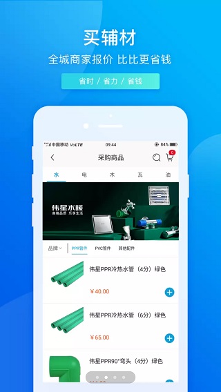 辅材采购:支持快速添加商品到购物车,一键发布采购需求,简化传统繁琐的建材采购流程。
