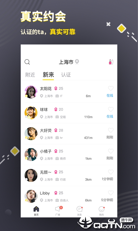 首页展示:平台根据性别提供个性化展示页面。男生可以看到附近、新来、认证三个分类标签,女生则能看到普通男生和VIP男士分类。附近功能会显示用户的位置和状态,方便快速发起约会。所有展示信息都经过严格审核,确保真实可靠。