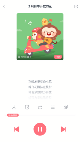 内置百万的儿歌资源,包含儿童故事、儿童游戏、儿童漫画、儿童童话资源等等,涵盖国内外经典作品和原创内容,定期更新保持内容新鲜度。支持精准逐字歌词显示功能,宝宝们可以一边听一边学习,培养语言能力和音乐感知力,歌词同步显示帮助孩子更好地理解歌曲内容。还有大量的读物资源,比如作文诵读、百科全书、三字经等等,都是育儿的好内容,这些读物都配有专业配音和精美插图,提升阅读体验。动画儿歌故事轻松播放,可以支持缓存功能,让宝宝们不仅可以听还可以看,离线状态下也能享受优质内容。有趣的学习技巧模块,让宝宝学习数字,认识汉字,通过小游戏增长知识,游戏设计符合儿童认知发展规律。