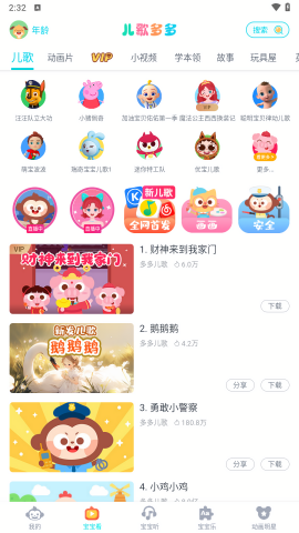 百万儿歌故事、动画绘本、互动场景、睡前故事、音律童谣、亲子舞蹈……更多优选内容给孩子一个快乐的童年。新增家长社区功能,可以交流育儿经验和早教心得。现在开通vip可享用更多会员权益!包括无广告、高清画质等优质服务。儿歌直播入口新上线,快来观看吧~直播内容包括名师课堂、亲子活动等丰富形式。会不定期更新儿歌动画视频资源哦~确保内容与时俱进。修复一些用户反馈的问题,优化界面交互设计。启动速度优化,启动更快,减少等待时间。不需要登录,解锁了所有VIP功能,使用更便捷。去除了广告推送,免更新,提供纯净的使用环境。
