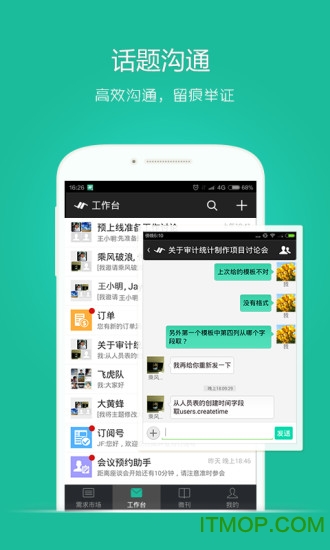 话题沟通:专为工作场景设计的即时通讯工具,支持按项目主题组织讨论,消息记录自动归档,便于后续查阅和知识沉淀,提高团队协作效率。