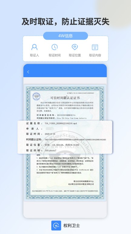 使用权利卫士进行取证非常简单便捷。首先打开软件,根据实际需求选择合适的取证方式,比如拍照取证。点击拍照按钮完成拍摄后,立即点击固化按钮,系统会自动为证据添加可信时间戳。取证完成后,您可以在证据页面查看详细内容,包括时间戳认证证书。这个证书文件格式为.tsa,是您在法庭上维权的重要凭证,可以直接打开查看。