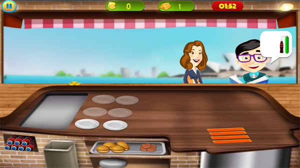 在经营过程中,玩家需要使用金币和金块来升级厨房设备、装饰餐厅环境以及购买特殊食材。这些资源可以通过完成订单和达成关卡目标来获得。游戏操作简单直观:按照提示将面包放入盘中,将肉馅放在烤架上,待其烤熟后组装成汉堡,最后将成品交给顾客。需要注意的是,要及时处理变质食材,保持餐厅卫生。