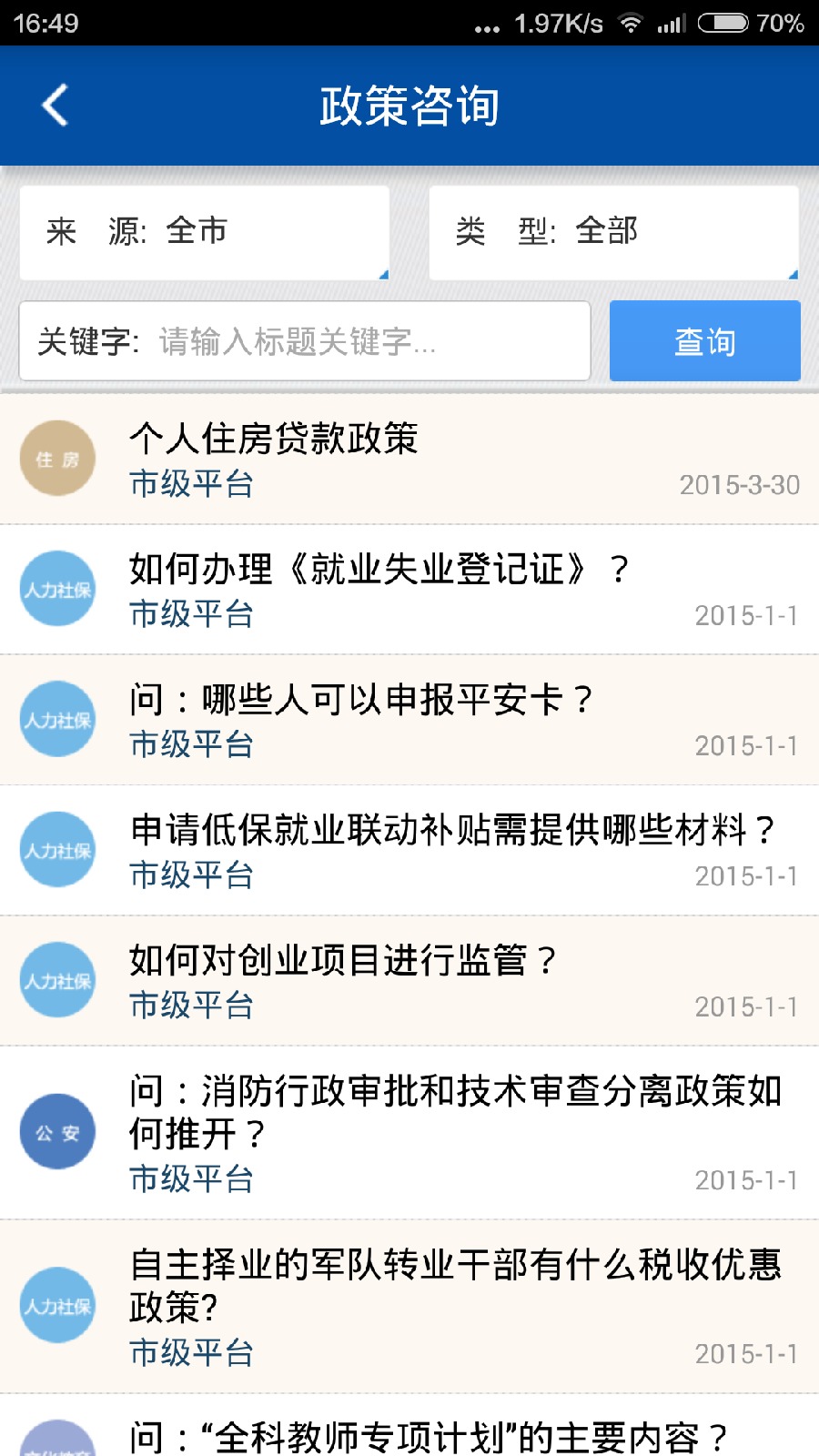 点击政策咨询版块可查询全市或下级区县不同类型的政策,也可以输入关键字进行查询。系统会智能匹配相关政策文件,并提供详细的解读说明。