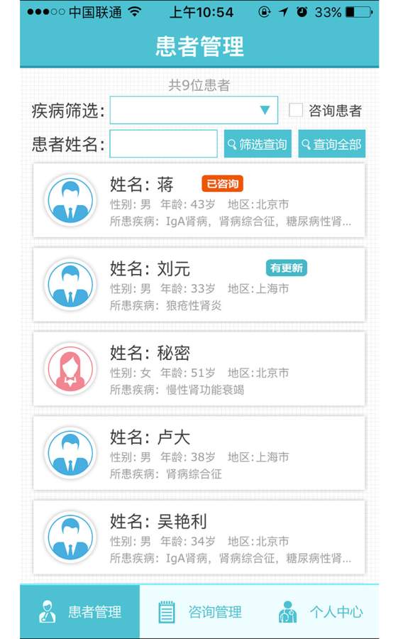 该系统实现了医患信息的实时互通,医生可以通过平台查看患者从"肾病咨询中心"APP提交的各项健康数据,包括症状记录、用药情况、检查结果等。这些数据会自动整合形成完整的随访数据库,不仅便于医生进行临床决策,也为医学研究提供了宝贵的数据资源。基于这些详实的患者信息,医生能够给出更加精准、科学的诊疗建议。