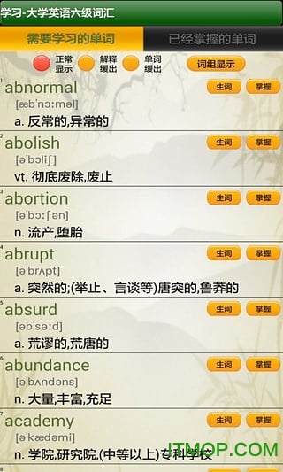 1.提供一览学习模式、逐词精学模式、错题强化模块和模拟测试模块四种学习路径,满足不同场景下的学习需求。测试模块包含听力辨词、拼写填空、词义匹配等七种题型,全面检测掌握程度。
