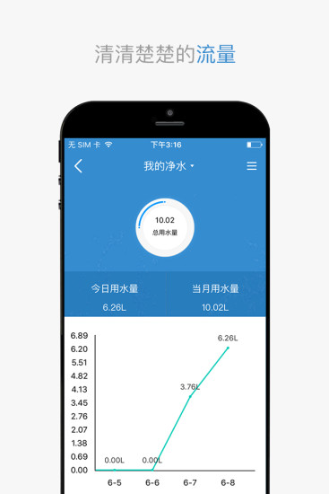 【用水日志】:详细记录您的日常用水数据,包括总用水量、月度用水趋势、单日用水高峰等,帮助您了解家庭饮水习惯。数据支持多维度分析,可以按周、月、季度查看用水报告,为节约用水提供科学依据。