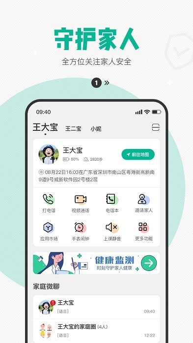 双向通话功能:在西瓜皮App主界面点击电话图标即可拨打孩子手表。通话质量清晰稳定,支持免提模式。家长还可以开启监听功能,此时孩子手表会静默接听,不会发出任何提示音,让家长在不打扰孩子的情况下了解周围环境状况。