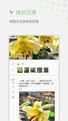 成长日记:详细记录每株植物的生长变化,从发芽到开花,每一个重要时刻都不会错过。你可以上传照片、添加文字描述,建立专属的植物成长档案。