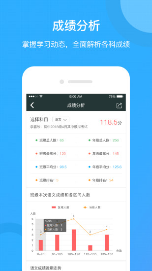 【学生成绩】专业的成绩分析模块,家长和老师可通过APP查看学生每次考试的成绩详情,系统提供多维度的成绩分析报告,帮助全面掌握学习动态。