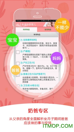 产前准备:智能待产包清单生成器,根据预产期季节自动推荐必备物品,支持多人协作编辑,还有医院待产攻略等实用资讯。