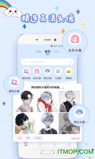 【个性】提供10大分类,200多个子类,分类清晰明确,快速定位自己的爱好。让你的头像与众不同,个性十足。