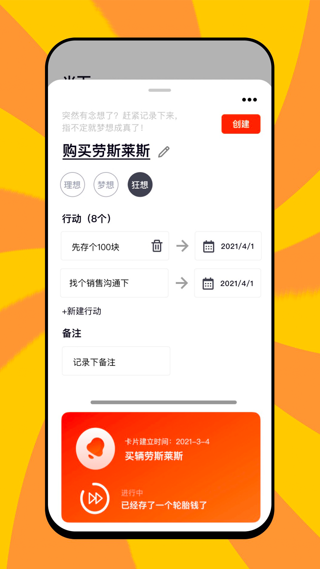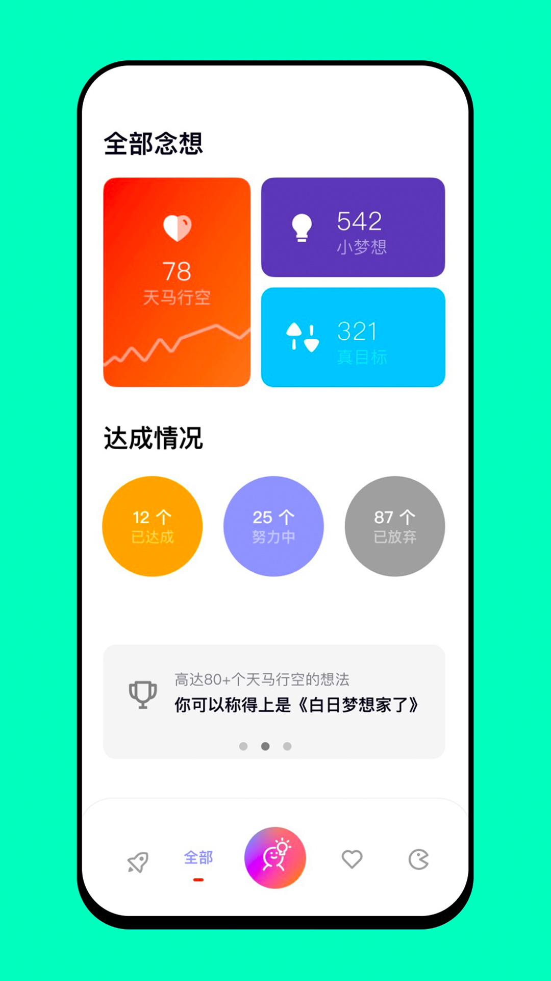 人类思维永不停歇,每时每刻都在产生新的想法,我们将这些转瞬即逝的思绪统称为【念想】。研究表明,普通人每周会产生数十个不同想法,一年累计可达上千个。这些想法可能关乎生活琐事,比如"该去理发了";也可能是人生规划,如"三年内要买房"。但绝大多数想法都如流星划过夜空,转瞬即逝。念想APP将这些思绪系统归类为三种类型:浪漫不羁的【狂想】、踮脚可及的【梦想】和必须达成的【理想】。通过科学分类和定期回顾,帮助用户将飘忽的念头转化为切实可行的行动计划。