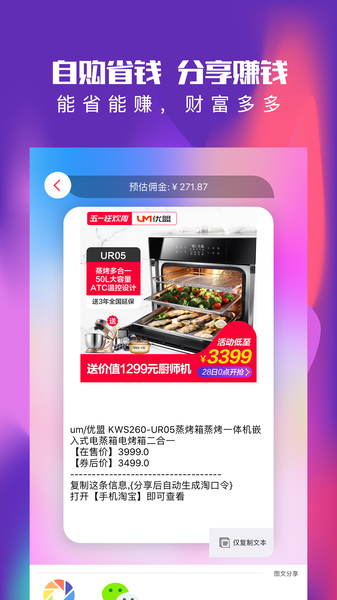 ,支持用户转发链接分享转发各种素材,他们购物自己赚钱。三级分销体系让推广收益透明可见,最高可获得商品售价15%的推广佣金。