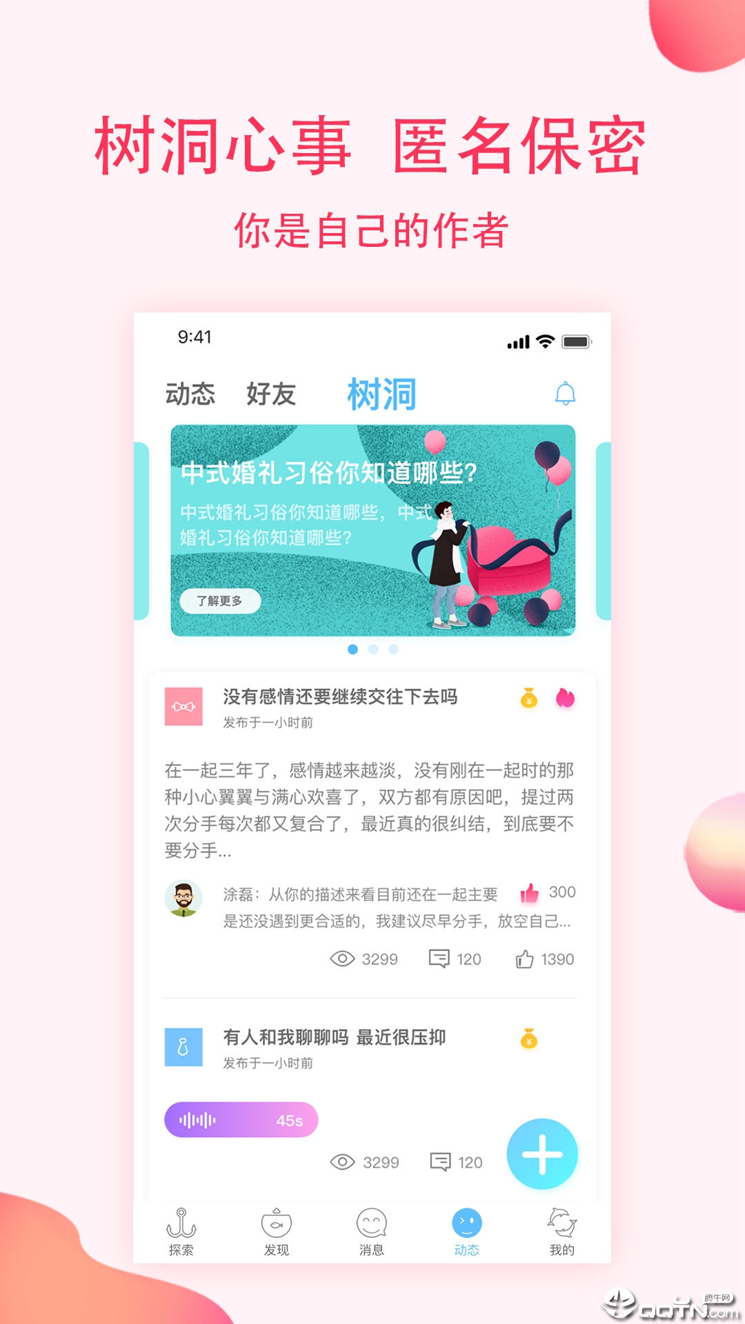 [倾听]特别设定匿名树洞功能,可以随时随地把无处诉说,又不想藏匿的内心话吐露出来。这里没有杠精,没有身份,没有人设,没有人指指点点,唯一有的是能够还你一片心灵的净土。专业的心理咨询师团队会定期精选树洞内容,给予温暖回应。