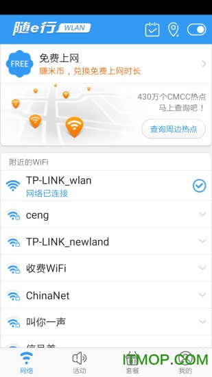 随e行WLAN手机版是中国移动推出的专业WiFi连接工具,覆盖全国440万个中国移动WLAN热点(包括CMCC、CMCC-WEB和CMCC-EDU),让您无论身处何地都能一键接入高速网络。此外,它还支持国际漫游功能,让您在海外也能享受安全、稳定、快速的WiFi服务。随e行全新升级后,界面设计更加时尚,科技感十足,用户体验大幅提升。新增的米币兑换商城更是亮点之一,用户可以通过积累米币兑换实物礼品、手机话费、流量包、电商折扣券等丰富奖励,让您的每一分上网时间都物超所值!我们致力于为您提供最优质的网络服务,让您用得顺心、玩得开心!